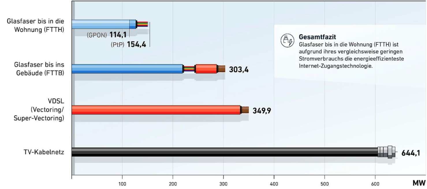 Bild Bundesverband Breitbandkommunikation BREKO (Deutschland): Gesamtstromverbrauch (Leistung in Megawatt) der Zugangstechnologien bezogen auf eine deutschlandweite Versorgung aller Haushalte. Quelle: Technische Hochschule Mittelhessen (THM).