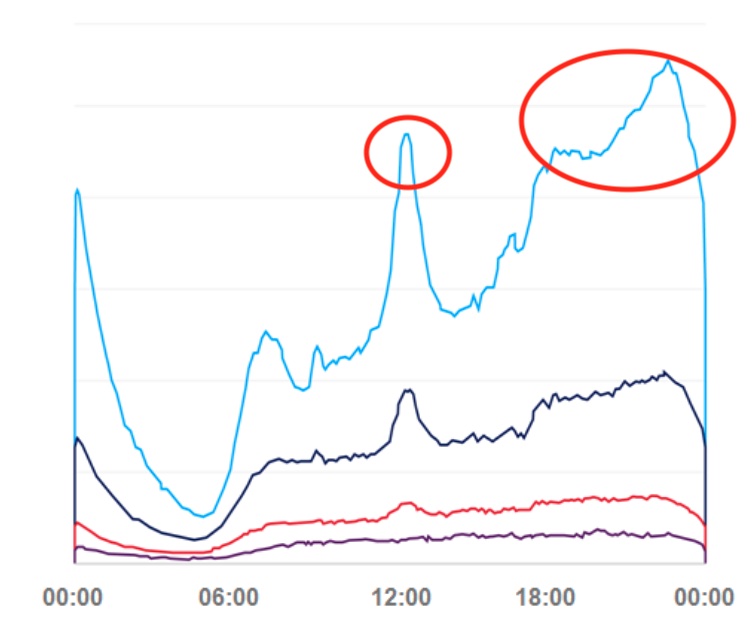 Bild Swisscom 2019: Mobilfunk Nutzung im Tagesverlauf. Die Farben markieren die Altersgruppen der Nutzer: 15-25, 26-45, 46-65 und 65+.