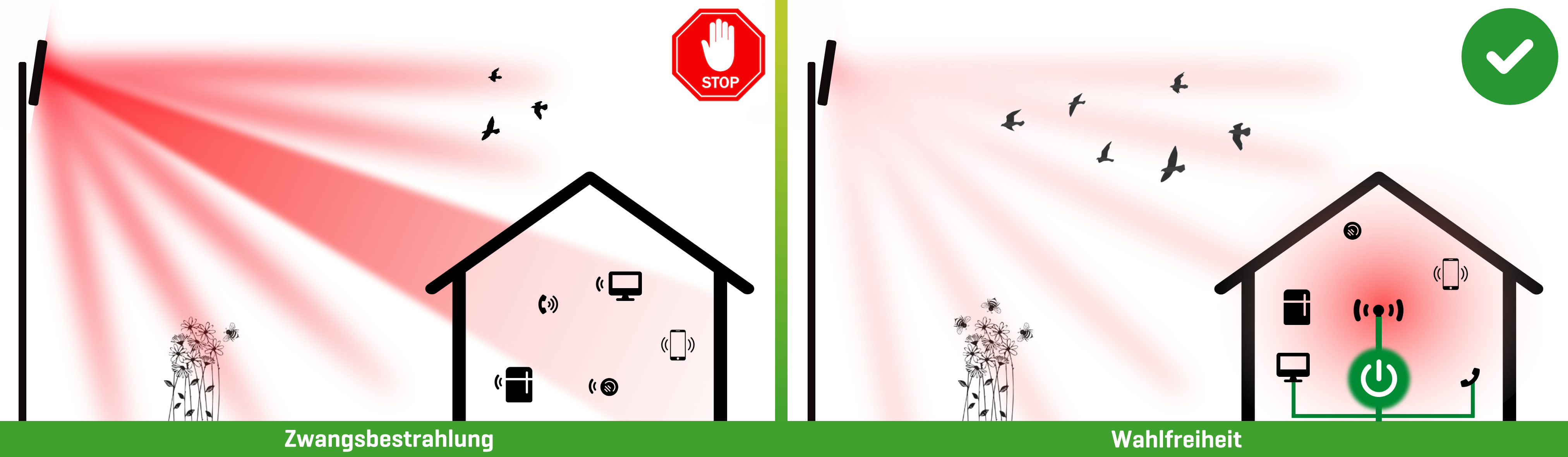 Sollte der Hausbesitzer auf der linken Seite (Bild oben links, starke, grosse Mobilfunk Antenne) erkranken, dann ist er möglicherweise erkrankt aufgrund einer unnötigen, aber behördlich verfügten Anlage, ... die er selber womöglich nicht einmal wollte oder gar Einsprache gemacht hat! Erkrankt dagegen der Hausbesitzer rechts, dann ist er selber schuld: Er hätte sein Sendegerät abschalten könnnen.