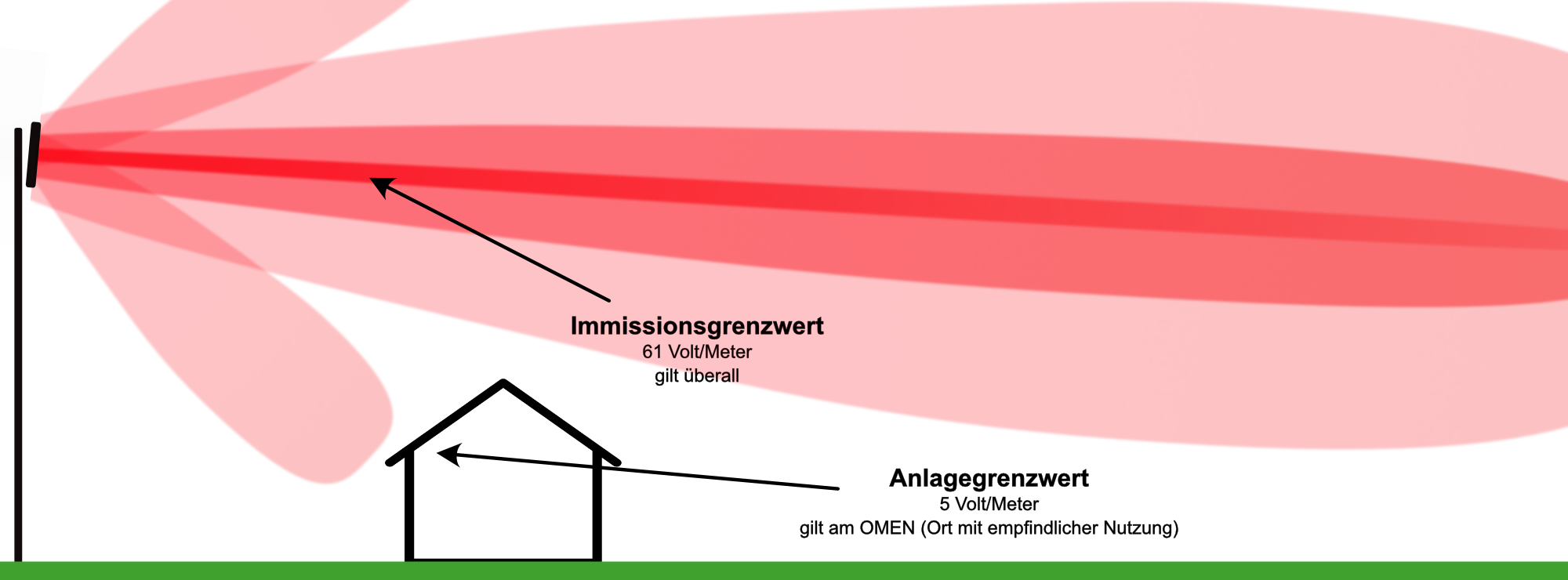Der Anlagegrenzwert ist in der 2000 in Kraft getretenen NISV (nicht ionisierende Strahlenverordnung) festgelegt. Dieser gilt am OMEN (Ort mit empfindlicher Nutzung) wo Menschen sich dauerhaft aufhalten. Mit 5 Volt/Meter liegt der Anlagegrenzwert ein Vielfaches über jenen Werten bei denen, wie oben genannt, bereits Beschwerden (Zwamborn) bemerkt wurden.
